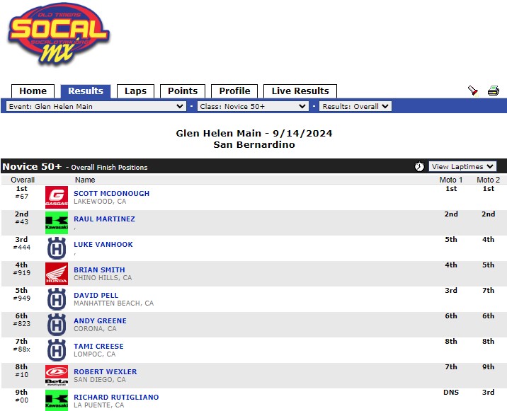 First race in 34 years. Special thanks to my wife and kids for pushing me to lose weight and to get healthy. All the diet and hiking in the Chino Hills State Park have helped me lose about 25 lbs. and have enough endurance to finish two 15 minute Motos. Thanks also to Matt and the Pro Circuit gang for some quick tips and adjusting my suspension setup. I had a lot of fun and a little anxiety but it all went away once the gate dropped. My goal was to finish, not crash, and gain some race experience. Mission accomplished and Thanks All for a Great Day of fun and racing! I'm sure I'll try it again and can "Send It" with some more practice and continued exercise.